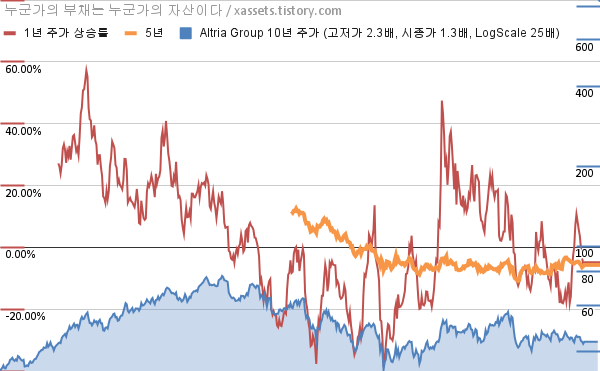 - 포스팅일 기준, 알트리아 그룹의 1, 3, 5, 10년 연평균 주가상승률은 -4.82%, -0.20%, -5.69%, 2.41%이다.