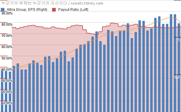 알트리아 그룹 EPS 성장률, 배당성향 차트 (2012년~2023년)