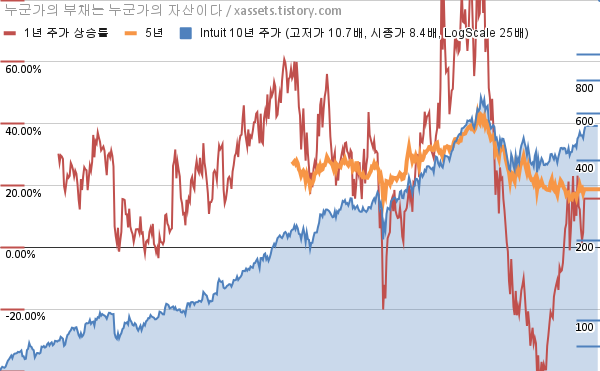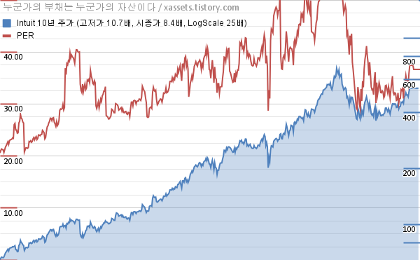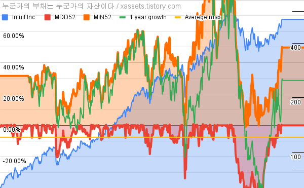 - 포스팅일 기준, 인튜이트의 1, 3, 5, 10년 연평균 주가상승률은 15.74%, 14.46%, 18.79%, 23.20%이다.