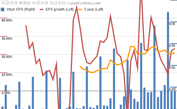 - 포스팅일 기준, 인튜이트의 1, 5년 연평균 EPS 성장률은 23.33%, 20.61%이다.