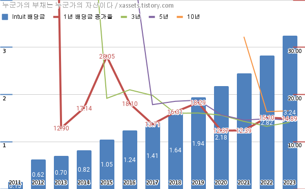 인튜이트 배당금 및 배당성장률 차트 (2011년~2023년)
