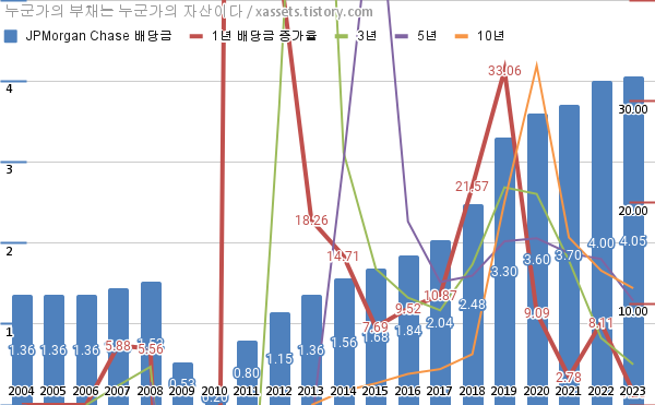 JP모건 체이서 배당금 및 배당성장률 차트 (2004년~2023년)