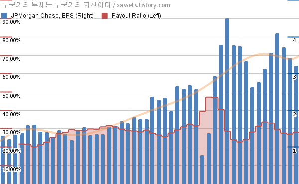 JP모건 체이서 EPS 성장률, 배당성향 차트 (2012년~2023년)