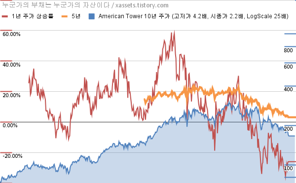 - 포스팅일 기준, 아메리칸 타워의 1, 3, 5, 10년 연평균 주가상승률은 -26.00%, -10.95%, 3.11%, 8.82%이다.