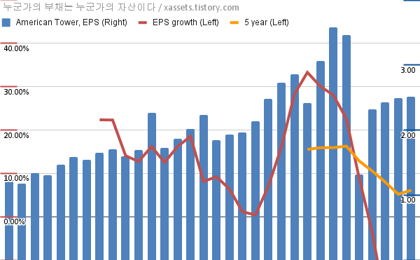 - 포스팅일 기준, 아메리칸 타워의 1, 5년 연평균 EPS 성장률은 -14.55%, 6.10%이다.