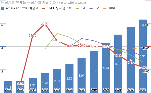 - 아메리칸 타워의 2023년 기준 1, 3, 5, 10년 연평균 배당성장률은 10.90%, 13.37%, 15.96%, 19.64%이다.
