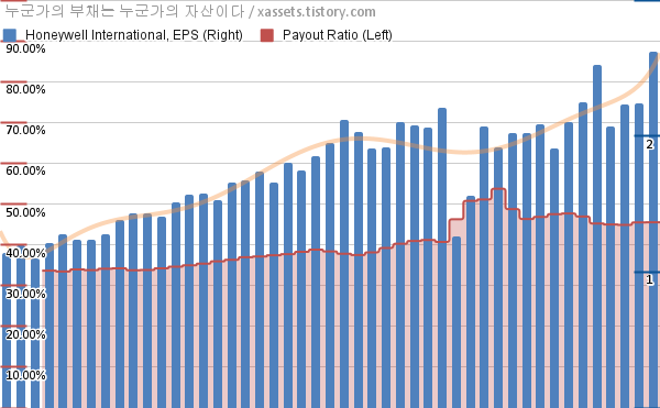 허니웰 인터내셔널 EPS 성장률, 배당성향 차트 (2012년~2023년)
