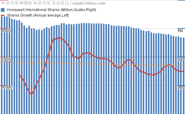 - 지난 1년 동안 허니웰 인터내셔널은 평균 2.49%의 자사주를 매입-소각했다.