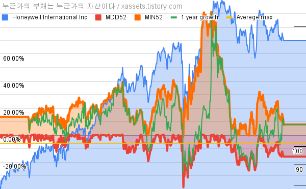 - 허니웰 인터내셔널의 10년 평균 MDD는 -16.27%고, 52주 최저가 대비 평균 상승률은 34.55%다.