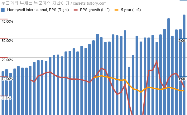 - 포스팅일 기준, 허니웰 인터내셔널의 1, 5년 연평균 EPS 성장률은 4.33%, 2.72%이다.