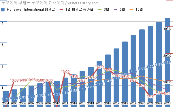 허니웰 인터내셔널 배당금 및 배당성장률 차트 (2004년~2023년)