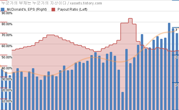 맥도날드 EPS 성장률, 배당성향 차트 (2012년~2023년)