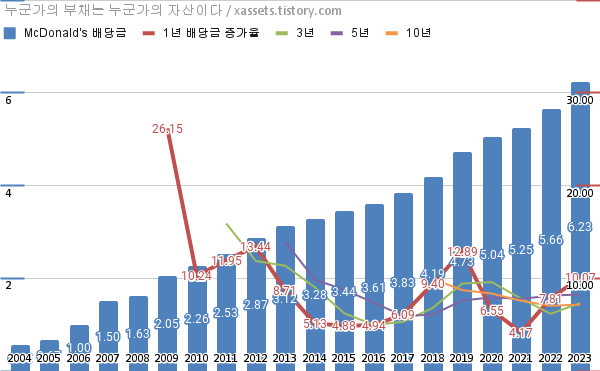 맥도날드 배당금 및 배당성장률 차트 (2004년~2023년)
