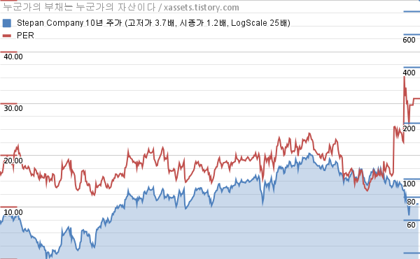 - 포스팅일 기준, 스테판 컴퍼니의 1, 3, 5, 10년 연평균 주가상승률은 -32.78%, -17.90%, -5.08%, 0.59%이다.