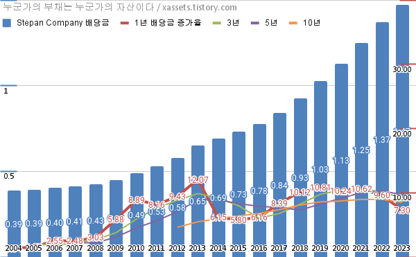 스테판 컴퍼니 배당금 및 배당성장률 차트 (2004년~2023년)