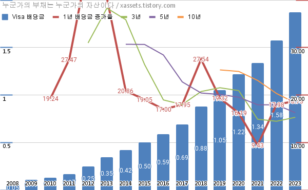 비자 배당금 및 배당성장률 차트 (2008년~2023년)