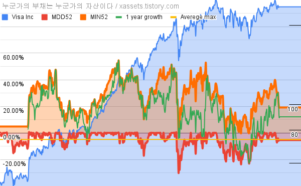 - 비자의 10년 평균 MDD는 -4.94%고, 52주 최저가 대비 평균 상승률은 28.27%다.