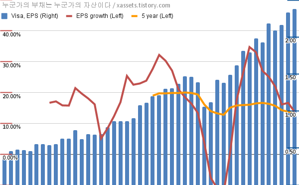 - 포스팅일 기준, 비자의 1, 5년 연평균 EPS 성장률은 13.71%, 13.20%이다.