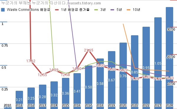 - 웨이스트 커넥션스의 2024년 기준 1, 3, 5, 10년 연평균 배당성장률은 11.43%, 11.46%, 11.96%, 13.91%이다.