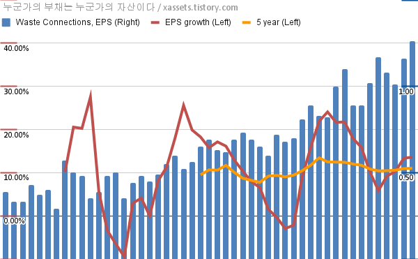 - 포스팅일 기준, 웨이스트 커넥션스의 1, 5년 연평균 EPS 성장률은 13.60%, 11.05%이다.