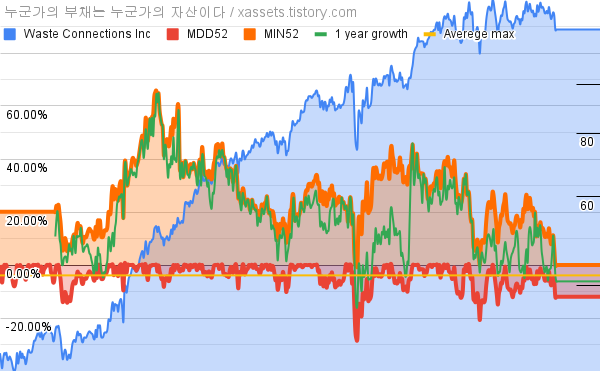 - 웨이스트 커넥션스의 10년 평균 MDD는 -3.91%고, 52주 최저가 대비 평균 상승률은 26.88%다.