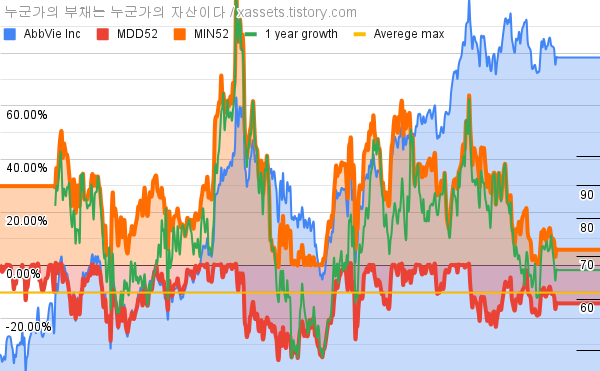 - 애브비의 10년 평균 MDD는 -10.43%고, 52주 최저가 대비 평균 상승률은 28.28%다.