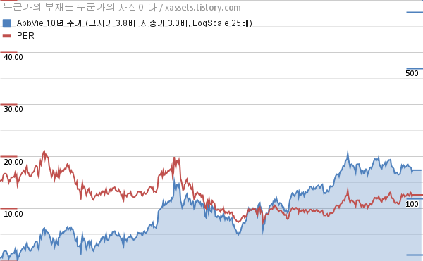- 포스팅일 기준, 애브비의 1, 3, 5, 10년 연평균 주가상승률은 -5.88%, 17.75%, 11.79%, 11.21%이다.