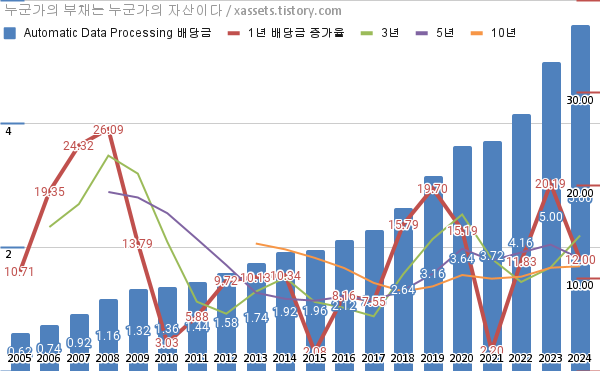 - ADP의 2024년 기준 1, 3, 5, 10년 연평균 배당성장률은 12.00%, 14.61%, 12.12%, 11.30%이다.