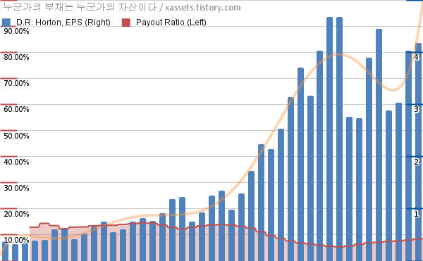 D.R. 호튼 EPS 성장률, 배당성향 차트 (2014년~2023년)