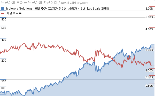 모토로라 솔루션스 배당수익률 및 주가 상승률 차트 (2013년~2023년)