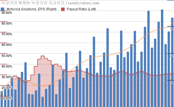 모토로라 솔루션스 EPS 성장률, 배당성향 차트 (2012년~2024년)