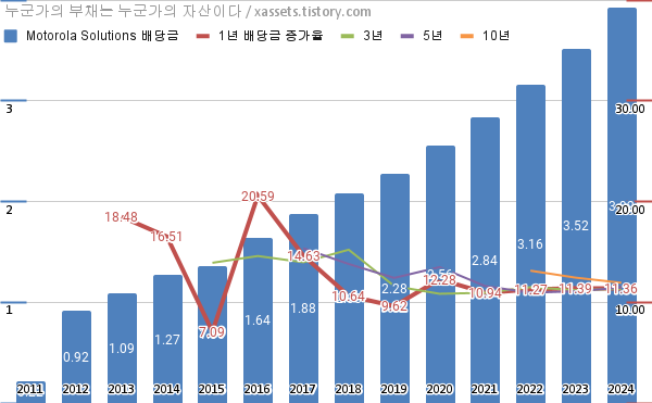 - 모토로라 솔루션스의 2024년 기준 1, 3, 5, 10년 연평균 배당성장률은 11.36%, 11.34%, 11.45%, 11.93%이다.