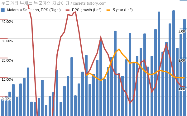 - 포스팅일 기준, 모토로라 솔루션스의 1, 5년 연평균 EPS 성장률은 5.01%, 9.72%이다.