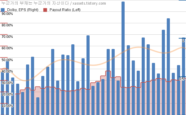 돌비 EPS 성장률, 배당성향 차트 (2014년~2023년)