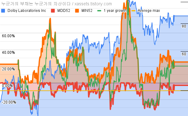 - 돌비의 10년 평균 MDD는 -9.45%고, 52주 최저가 대비 평균 상승률은 26.38%다.