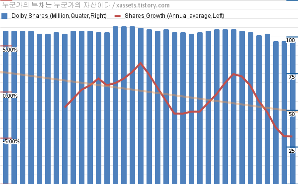 - 지난 1년 동안 돌비는 평균 4.84%의 자사주를 매입-소각했다.