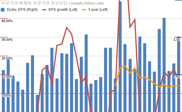 - 포스팅일 기준, 돌비의 1, 5년 연평균 EPS 성장률은 6.77%, 3.80%이다.