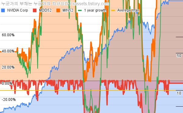 - 엔비디아의 10년 평균 MDD는 -12.10%고, 52주 최저가 대비 평균 상승률은 109.53%다.