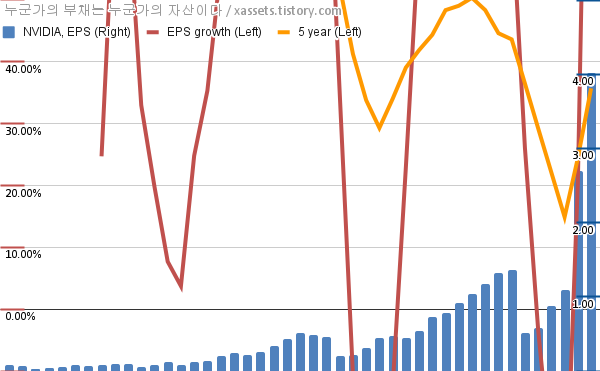 - 포스팅일 기준, 엔비디아의 1, 5년 연평균 EPS 성장률은 130.50%, 35.71%이다.