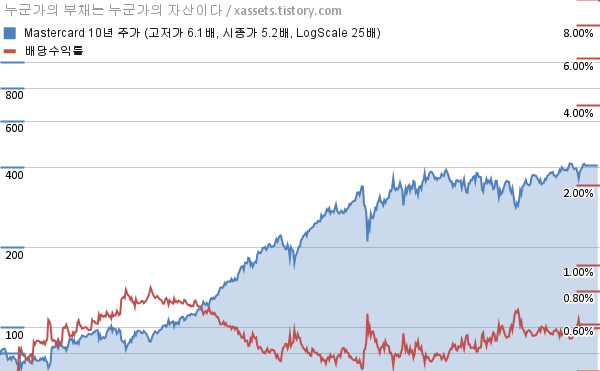 마스터카드 배당수익률 및 주가 상승률 차트 (2013년~2023년)