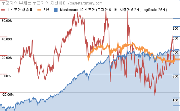 - 포스팅일 기준, 마스터카드의 1, 3, 5, 10년 연평균 주가상승률은 17.03%, 7.63%, 15.88%, 17.45%이다.