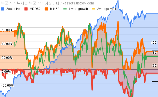 - 조에티스의 10년 평균 MDD는 -6.88%고, 52주 최저가 대비 평균 상승률은 34.23%다.