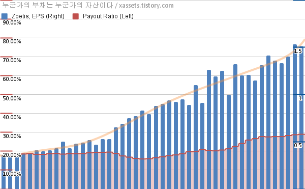 조에티스 EPS 성장률, 배당성향 차트 (2013년~2024년)