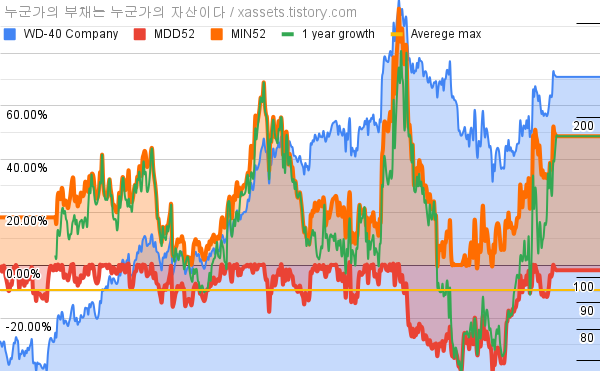 - WD-40 컴퍼니의 10년 평균 MDD는 -9.45%고, 52주 최저가 대비 평균 상승률은 25.58%다.