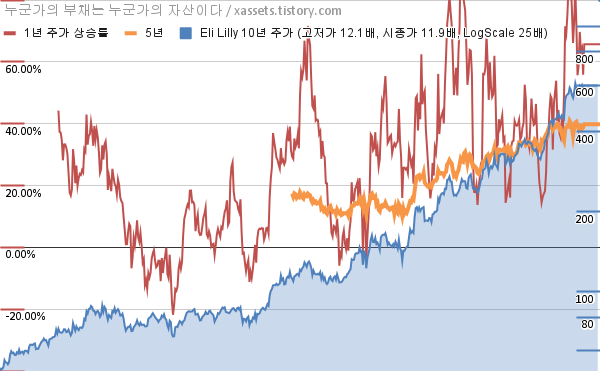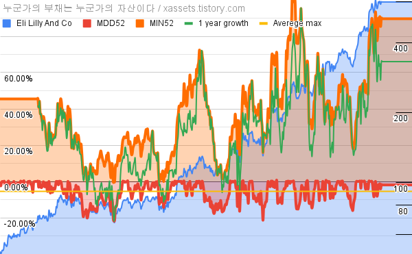 - 엘리 릴리의 10년 평균 MDD는 -5.47%고, 52주 최저가 대비 평균 상승률은 36.32%다.