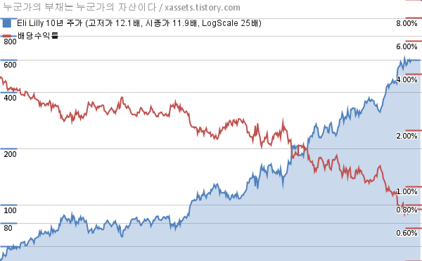 엘리 릴리 배당수익률 및 주가 상승률 차트 (2013년~2023년)