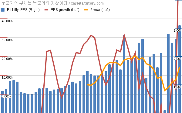 - 포스팅일 기준, 엘리 릴리의 1, 5년 연평균 EPS 성장률은 86.32%, 14.36%이다.