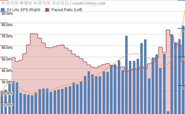 엘리 릴리 EPS 성장률, 배당성향 차트 (2012년~2024년)