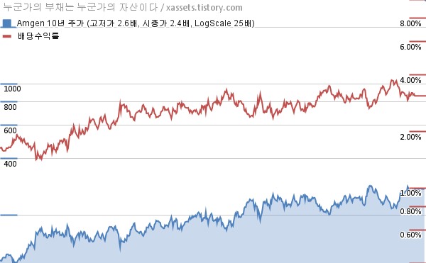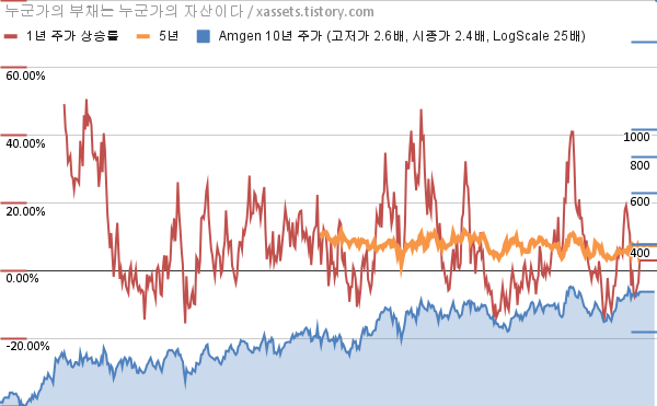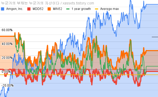 - 암젠의 10년 평균 MDD는 -7.88%고, 52주 최저가 대비 평균 상승률은 20.11%다.