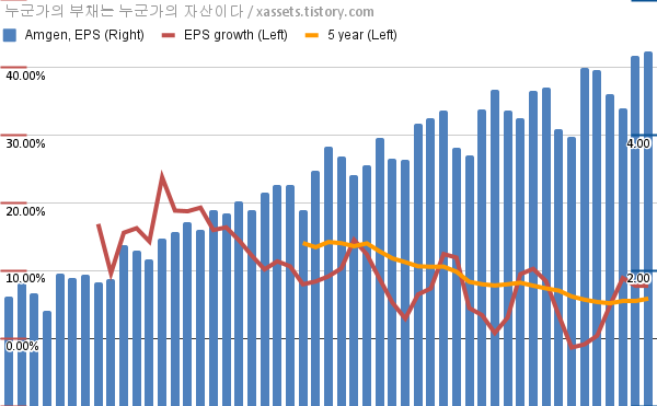 - 포스팅일 기준, 암젠의 1, 5년 연평균 EPS 성장률은 7.76%, 5.87%이다.